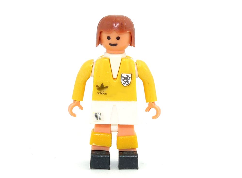 Freizeitsportler Fußballspieler Nummer 11 mit gelben Trikot und Stutzen