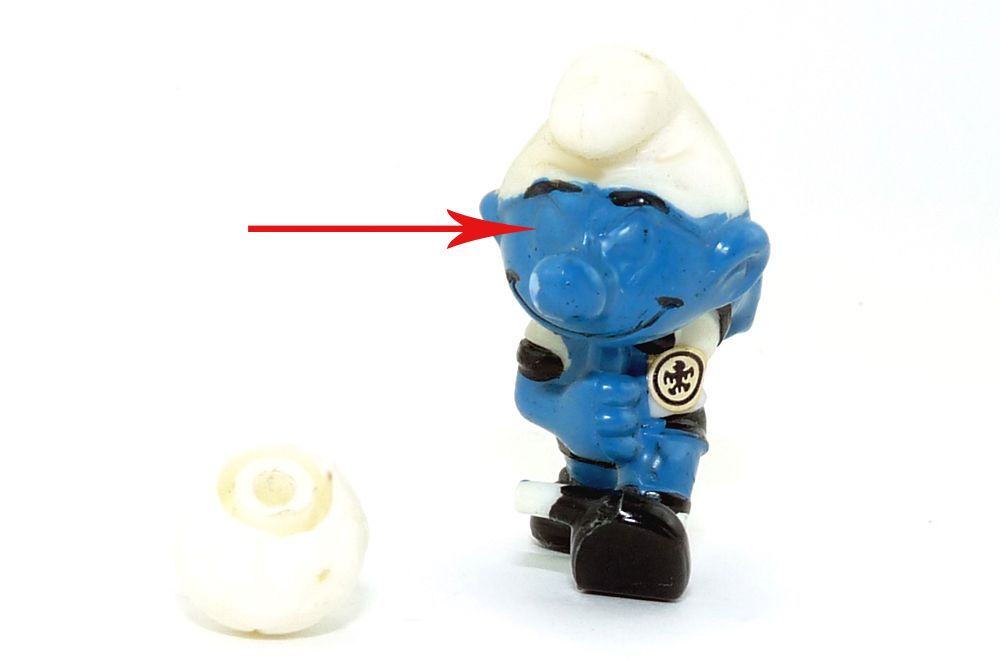 Mittelstürmer Schlumpf mit Ball, wo die Augen komplett unbemalt sind