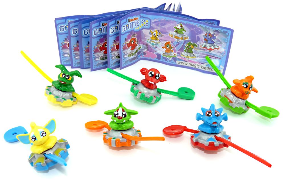 Satz Space-Kreisel mit Beipackzetteln. Alle 6 bunten Space Kreisel aus dem Jahr 2009