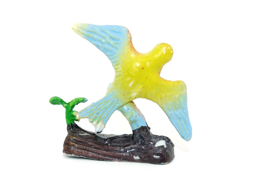 Vogel auf Ast. Bemalung vorne Orange und die Rückseite ist gelb / blau (Größe 30mm mal 30mm)